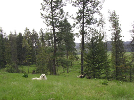 Lambing is over now, and everybody's been out grazing in the woods pastures, where they'll spend the summer. In this photo King the Great Pyrenees is clearly happy to be out of the winter barnyard, as he oversees his sheep in the "back 40" pasture. Barely visible to King's left, Alice and her twin lambs head uphill to join the rest of the flock for a cud-chewing session on top of the slope. Everyone seems to enjoy this pasture tremendously, with its combination of a high-and-dry slope with good visibility, and its cool, moist flat filled with lush, rich grass (see photos below).