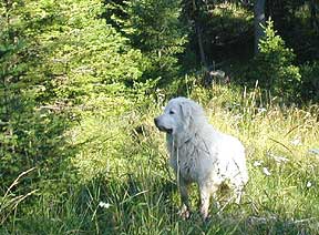 Day-Week-Month.) Not only was this marvelous creature a sweet, gentle, loving pet, but Peaches also had an important job on the farm and she did it very well! When we moved to SkyLines Farm in 1998, however, I knew Peaches was going to need some help. We are in serious coyote country here, cougar and bear wander through occasionally, and as the federal wolf reintroduction program begins to take off, every year more wolves are being sighted hunting closer and closer to this farm. I knew it was only a matter of time before my tasty lambs were discovered by the local predators. Though donkeys are known for intensely disliking coyotes, a lone donkey certainly couldn't be expected to fend off all attacks single-handedly, while also trying to round up the sheep and keep them in a safe bunch. I began to look for guard dogs to work in concert with Peaches. Building