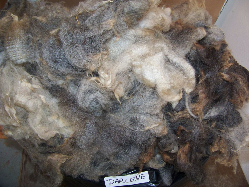 with fairly equal amounts of soft pale grey plus medium and dark grey. With moderate luster and a bit of spring from her Montadale background