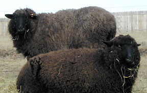 January 19, 2003 January is a quiet month on the farm. Once the ewes have been bred, winter becomes a time of quiet contentment, as we all settle in and wait for spring. Gestation in sheep is about five months long, and lambing will begin in early April. In the meantime, the "ladies-in-waiting" kick back, live the easy life, and focus on growing babies and fleeces. Here, Romney-cross sisters Rita (top) and Linda (bottom) while away the afternoon and wait for dinner to be served.